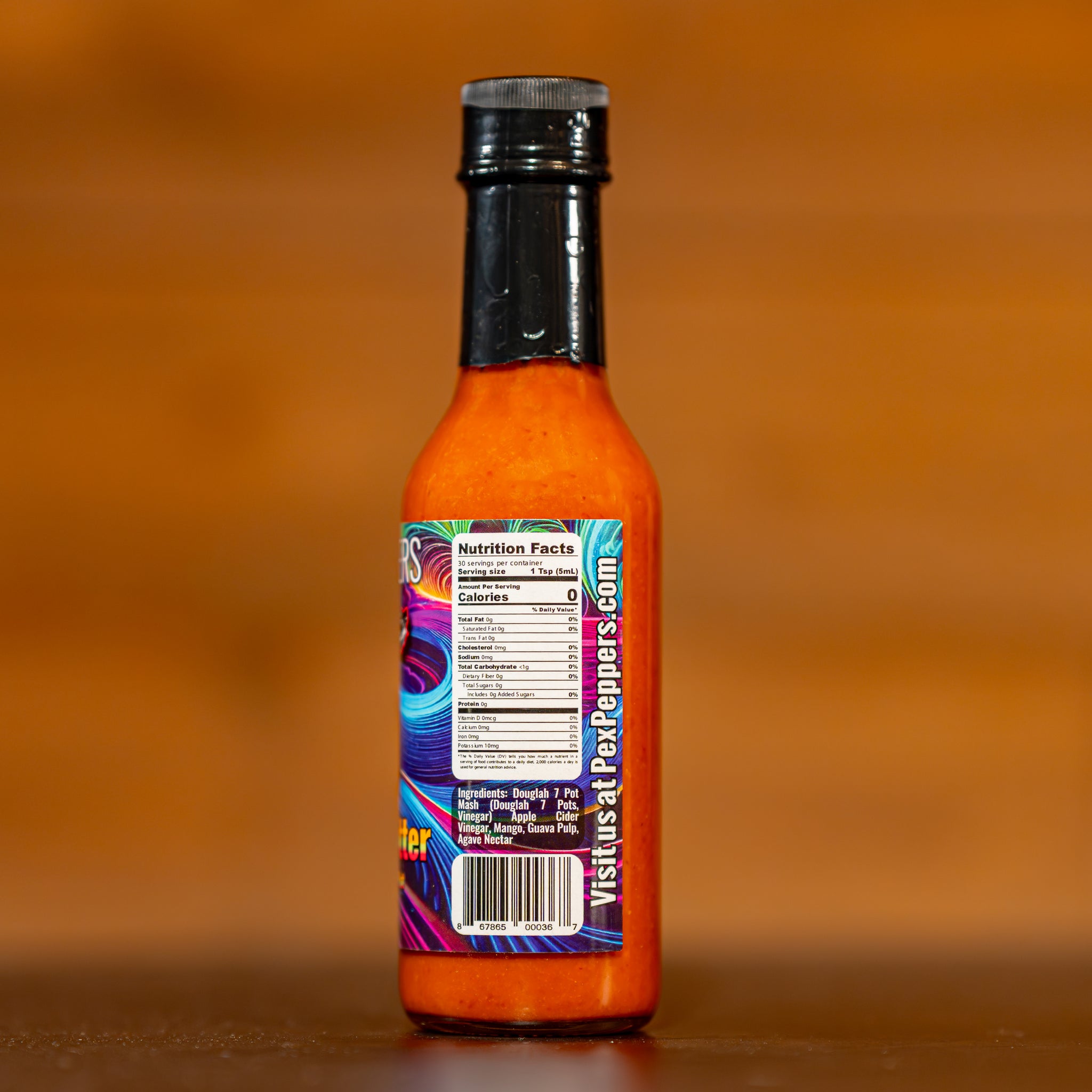 You'll want a glass of milk on stand-by when you eat this sauce. Douglah 7 Pot chiles rank in at 1.8 million SHU (scoville) and have been described as having an earthy floral flavor. The Douglah 7 pots have been combined with the tropical flavor of mangos and guava backed by a pinch of blue agave nectar to round out all the flavors in this nuclear sauce.